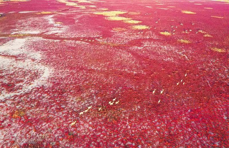 江苏省盐城市拥有582公里海岸线、76.97万公顷湿地,孕育着太平洋西岸和亚洲大陆边缘面积最大、生态保护最好的海岸型湿地。2019年,位于盐城市的中国黄(渤)海候鸟栖息地(第一期)成功列入世界遗产名录。图为2022年11月9日,在盐城东台条子泥湿地拍摄的麋鹿(无人机照片)。新华社记者 杨磊/摄